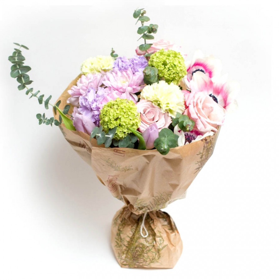 Ищите букет, который придется по душе самым утонченным натурам? Тогда это именно то сочетание роз, анемона, тюльпанов, гвоздик, хризантем, живого декора в виде вибурнума и папоротника, которое Вам необходимо. Несмотря на обилие компонентов, данный букет смотрится очень элегантно и оригинально, а несравненные ароматы свежесрезанных цветов надолго обеспечат комнату изысканными запахами весны и молодости.